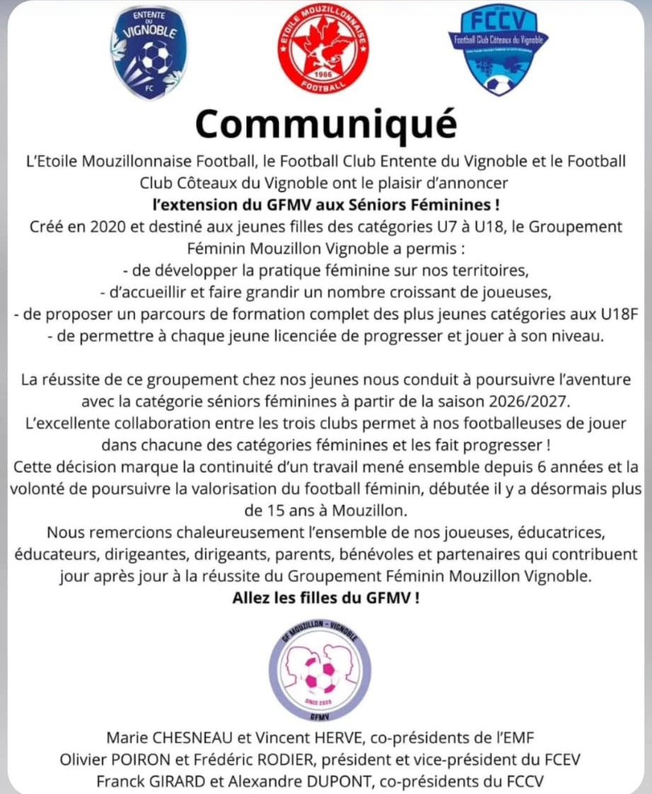 Le GFMV évolue et regroupera à partir de la saison 2026/2027 la catégorie séniors